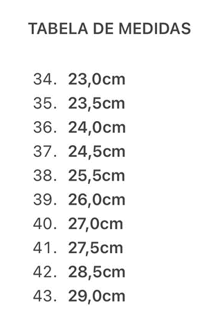 Linha: Importado; Língua Acolchoada; Palmilha Forrada; Solado Emborrachado.
